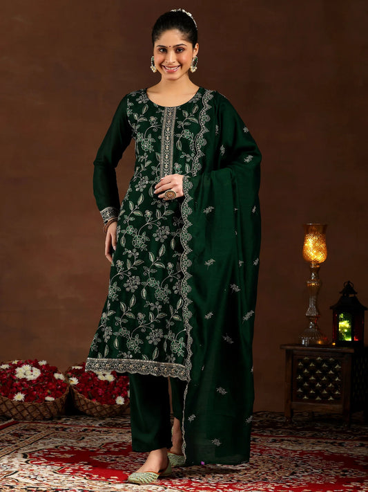 Green Embroidered Straight Kurta Salwar Suit Set With Dupatta