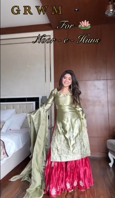 Kyra Olive Green Embroidered Kurta with Red Sharara Suit and Dupatta Set
