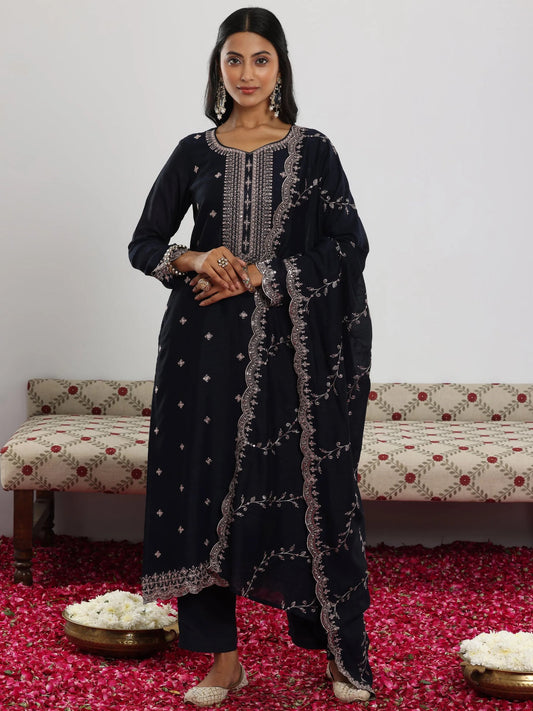 Navy Blue Embroidered Straight Kurta Suit Set With Dupatta