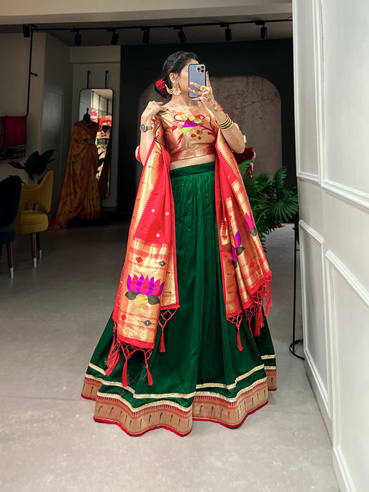 Look amazing adorning green color vichitra silk lehenga choli with beautiful plain with paithani lace...