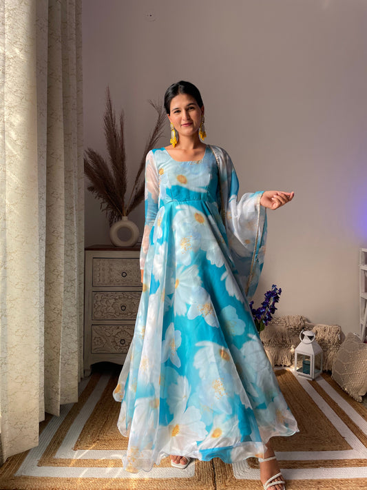 Blue Floral Digital Printed Pure Organza Gown