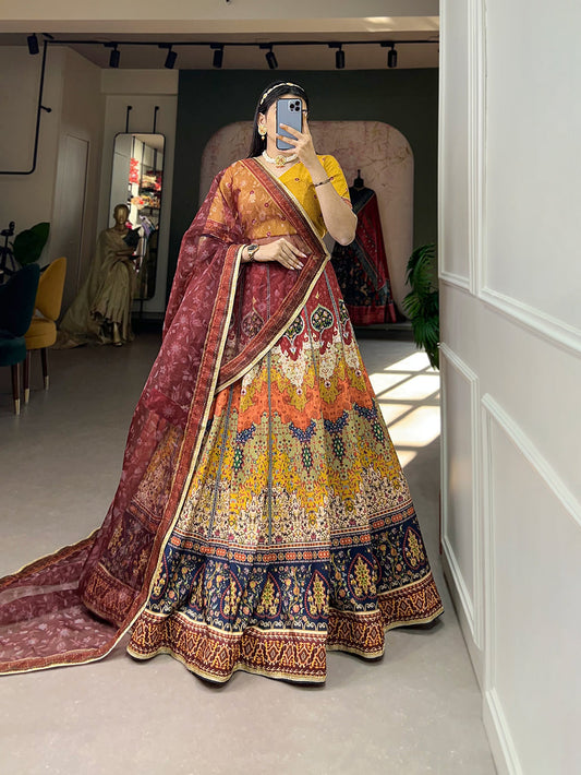 Brown Color Printed With Sequins Lace Border Vaishali Silk Rajasthani Lehenga Choli
