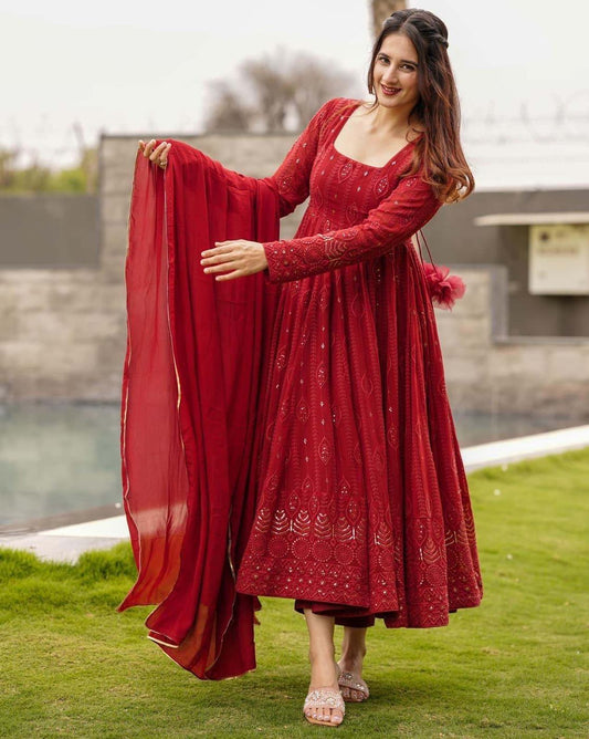 Anarkali Features: Fabric: Premium maroon fox georgette for a soft, flowy, and luxurious feel. Design: Fancy neck...