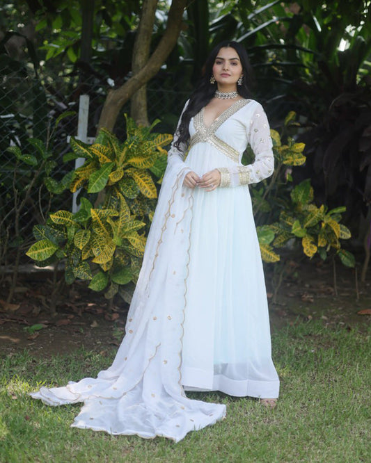 Wedding Wear Embroidered White Alia Cut Gown With Dupatta