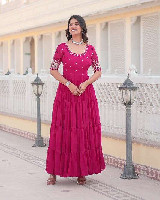 This Pink Color Four Layer Georgette Embroidered Gown is a captivating expression of grace and...