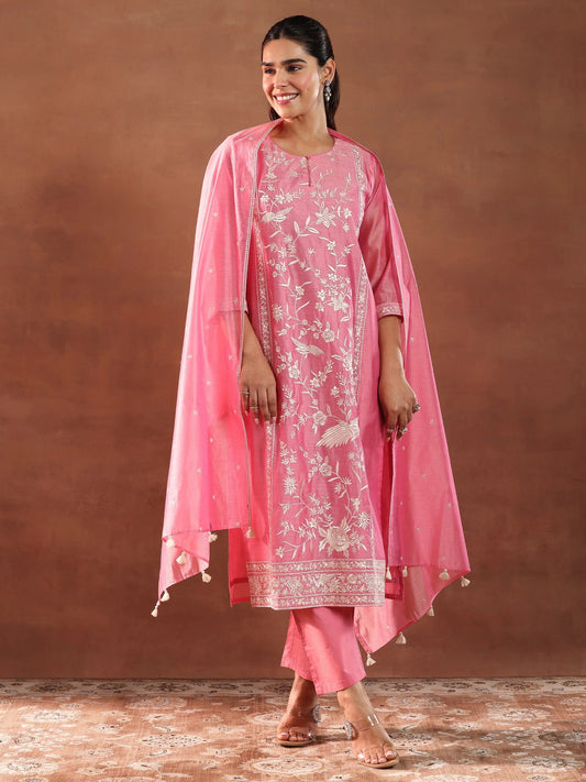 Pink Embroidery Work Straight Kurta Suit Set With Dupatta