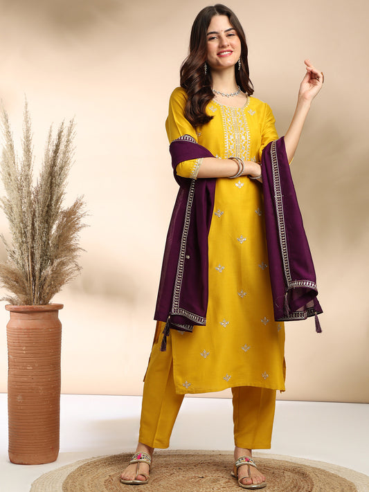 Yellow Embroidered Regular Kurta Suit Set With Dupatta