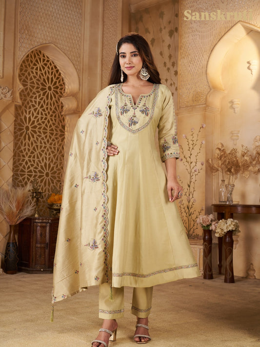 Biege Color Embroidered Cotton Kurta Suit Set With Dupatta