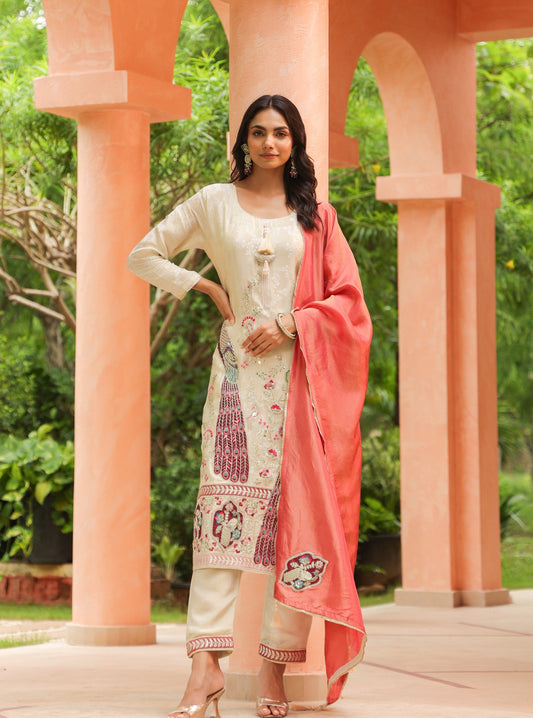 Off White Heavy Embroidered Chanderi Silk Kurta Set With Dupatta