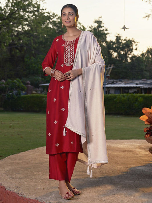 Maroon Embroidered Regular Sequinned Kurta Suit Set With Dupatta