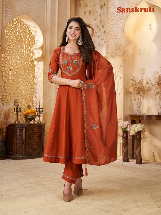 Orange Embroidery Work Neck Design Straight Kurta Suit Set With Dupatta