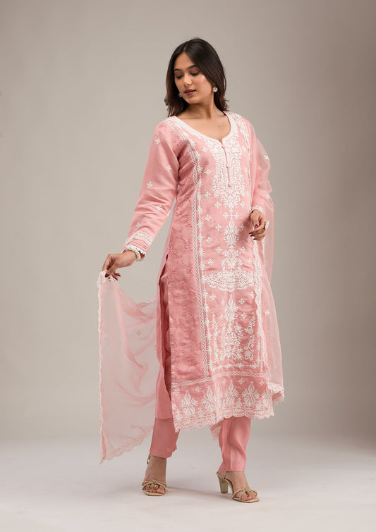 Peehira Rani Pink Yoke Design Notch Round Neck Embroidered Straight Kurta With Trousers & Dupatta