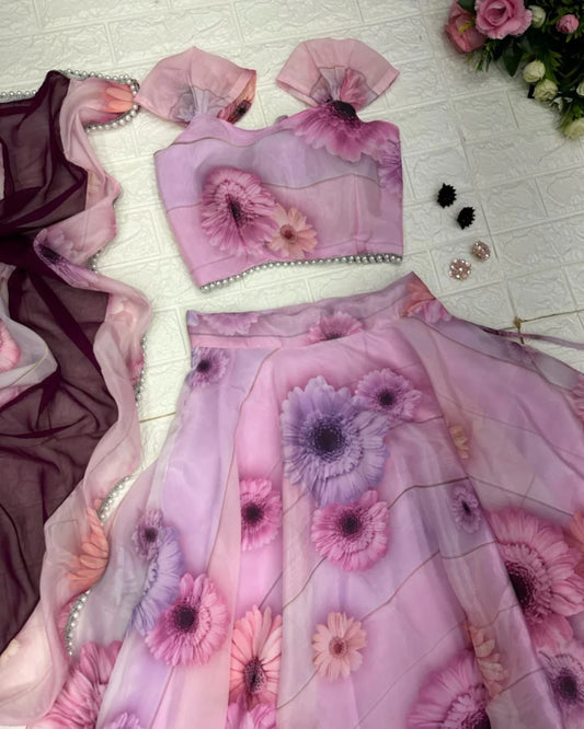 Stylish Sky Blue Color Organza Silk Digital Printed Lehenga Choli