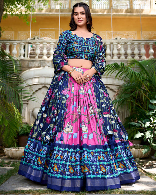 Sky Blue Color Print With Foil Work Tussar Silk Lehenga Choli