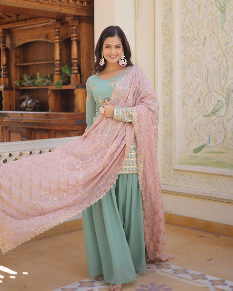 Embrace sophistication in this Beautiful Bottle Green Color Georgette Three-Piece Palazzo Suit. The deep and rich bottle green hue exudes elegance and charm, creating a striking and refined ensemble. Crafted from flowing Georgette fabric, the palazzo suit features intricate detailing that adds a touch of opulence to the overall look. The kurta, paired with wide palazzo pants, and a complementing dupatta, strikes the perfect balance between comfort and style. Ideal for various occasions, this Bottle Green Georgette Three-Piece Palazzo Suit is a delightful choice for those who seek a perfect blend of tradition and contemporary fashion. Step into any event with confidence and poise, embodying the understated beauty and refined allure of this enchanting suit.