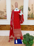 Dazzling Red Color Embroidery And Pearl Moti Work Suit Set With Dupatta