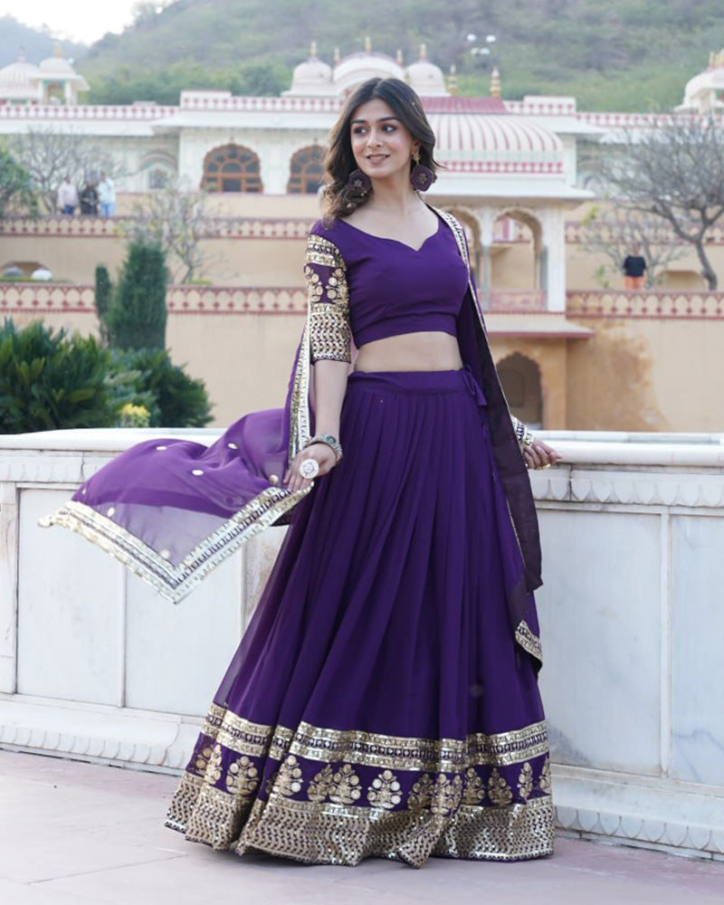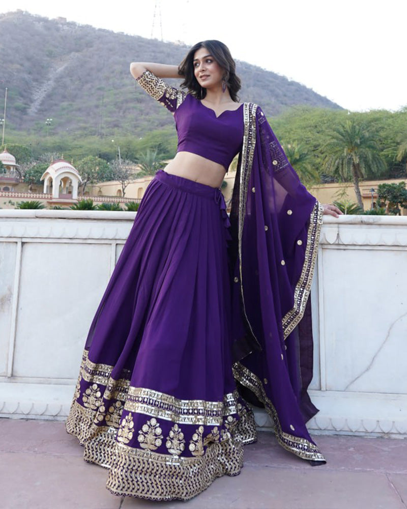 This Designer Purple Color Faux Blooming Semi-stitched Lehenga Choli showcases elegance and style. The ensemble features intricate blooming patterns on a rich purple fabric, exuding sophistication. Accompanied by a semi-stitched blouse, offering customization options, this attire ensures a perfect fit. Ideal for special occasions, celebrations, or weddings, it merges glamour with comfort, promising a memorable and refined look. Embrace sophistication with this captivating designer lehenga choli ensemble.