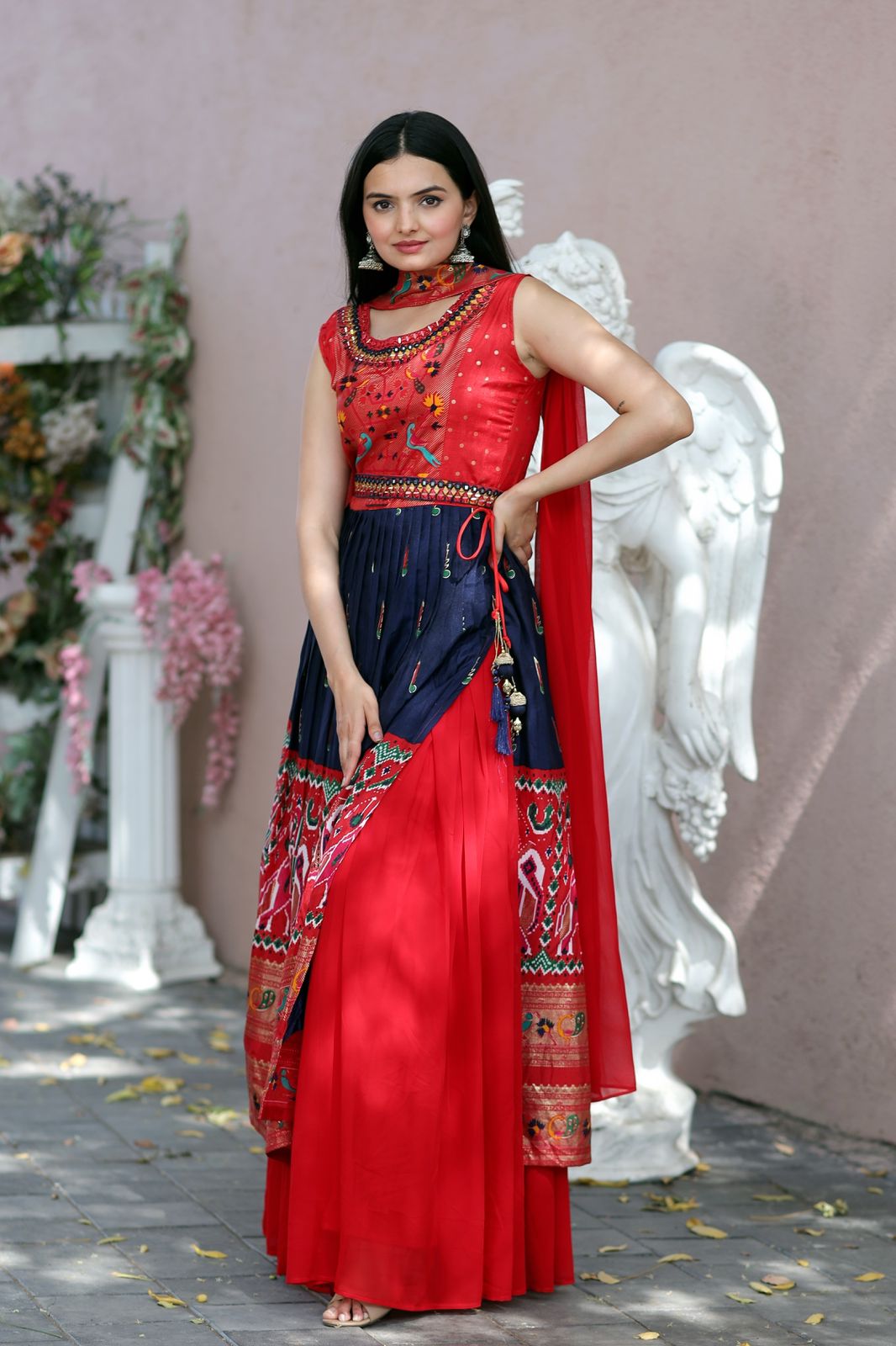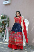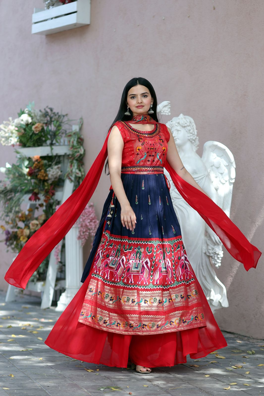Designer Hand Mirror Red With Navy Blue Sharara Suit