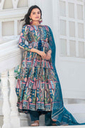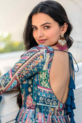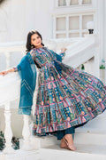 Devika Blue Multicolor Printed Flared Dress With Dupatta Set