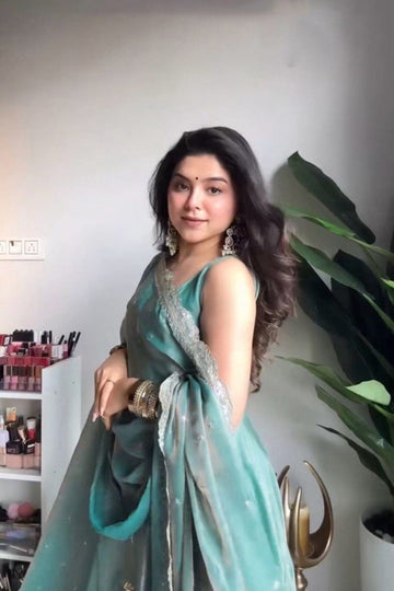 Work: Delicate thread embroidery with shimmering sequence work adds a graceful sparkle