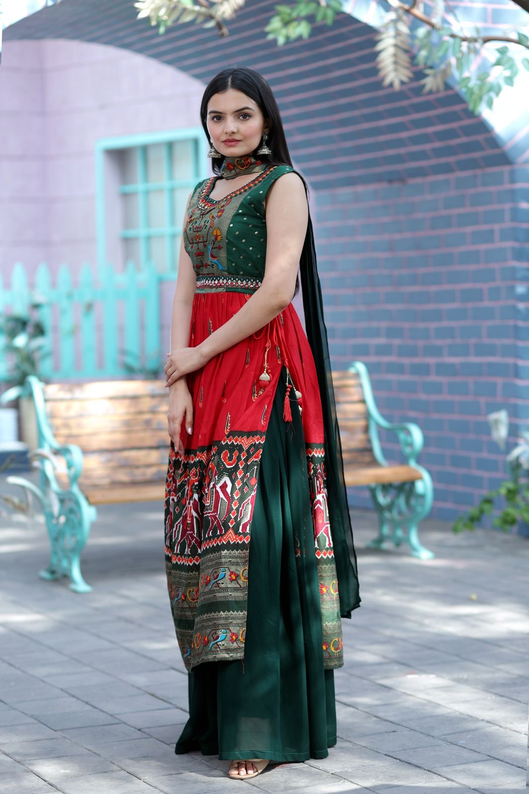 Designer Hand Mirror Work Green With Red Sharara Suit