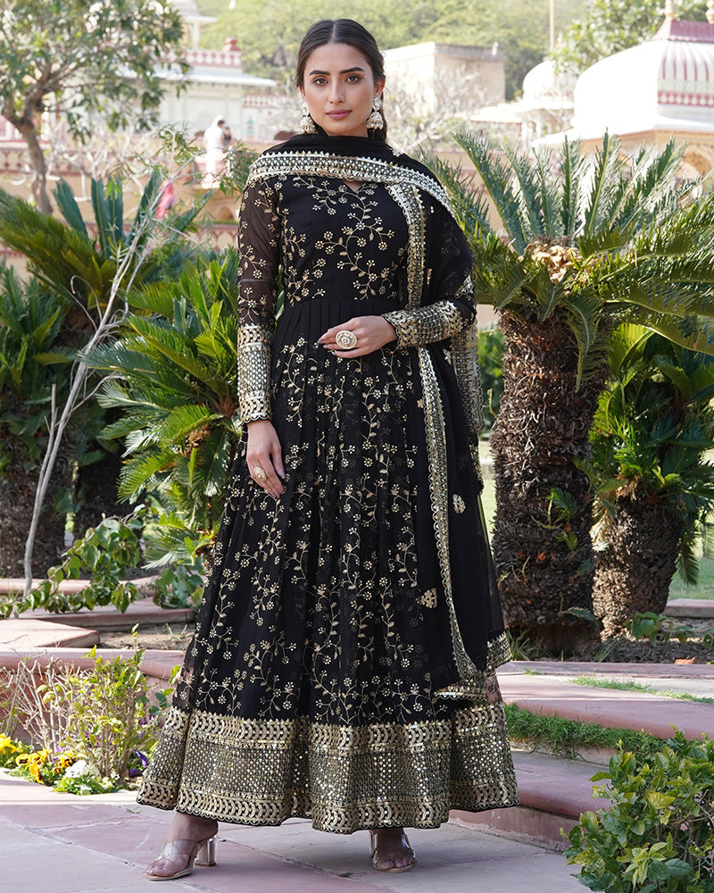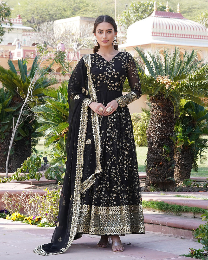 Faux Blooming Rich Sequence Embroidered Black Gown