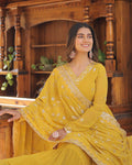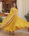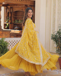 Radiate joy and elegance in our Yellow Color Faux Georgette Designer Anarkali Gown. Crafted with finesse, the flowing faux georgette fabric drapes gracefully, creating a stunning silhouette. The vibrant yellow hue adds a burst of energy and positivity to the ensemble, making it perfect for festive occasions. The designer detailing on the Anarkali gown enhances its visual appeal, striking the perfect balance between tradition and contemporary style. Step into the limelight with the sunny allure of this Yellow Color Faux Georgette Designer Anarkali Gown, designed to make a statement at weddings, parties, and special celebrations.