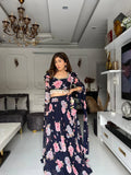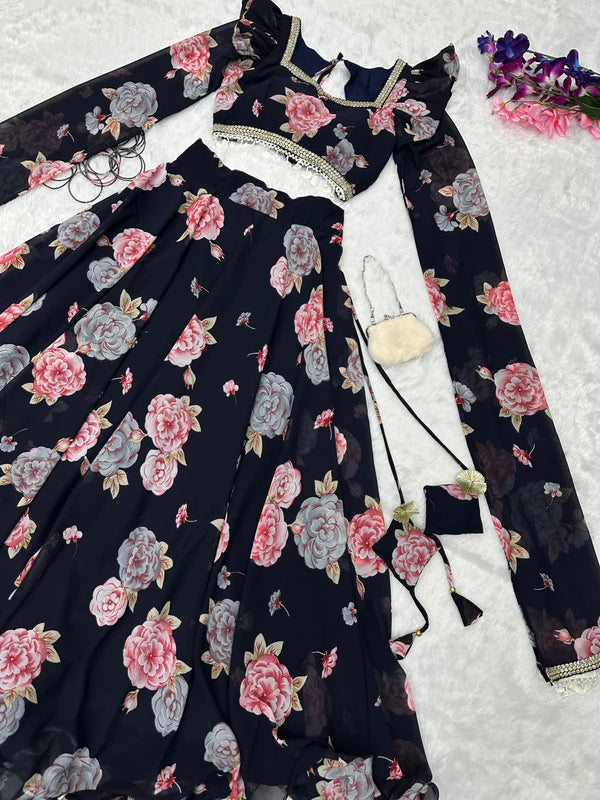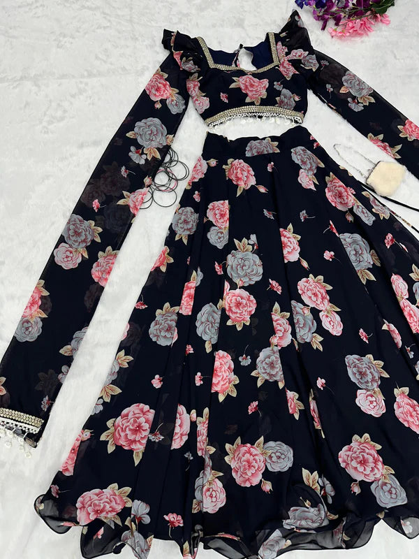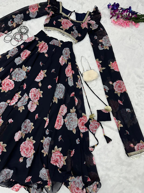 Flower Print Fancy Sleeves Pattern Black color Lehenga Choli