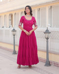 This Pink Color Four Layer Georgette Embroidered Gown is a captivating expression of grace and sophistication. Crafted from luxurious georgette fabric, the gown features intricate embroidery that adds an opulent touch to its design. The soft pink hue exudes femininity and charm, making it perfect for special occasions or formal events. With its four-layered construction, this gown offers a flowing silhouette that enhances the wearer's elegance and style. Step into the spotlight with confidence in this exquisite embroidered gown.