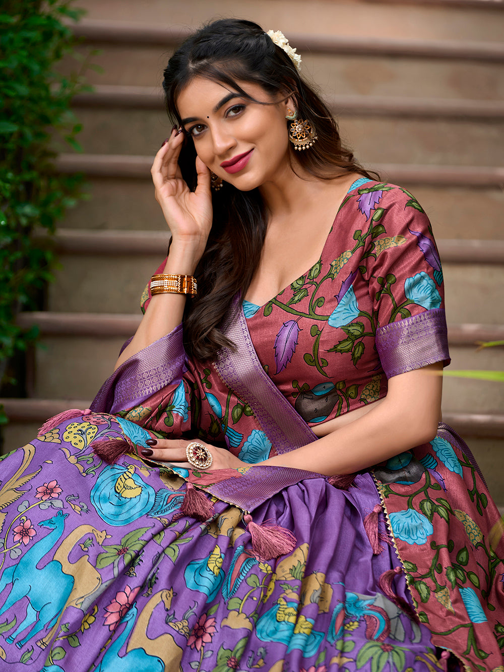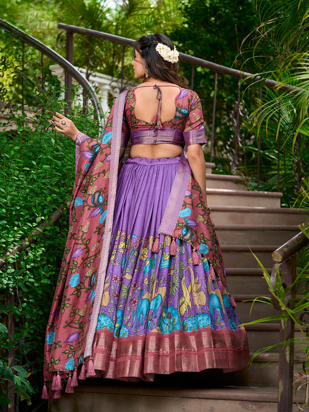Lavender Color Kalamkari Print With Zari Weaving Dola Silk Voni Lehenga Choli