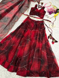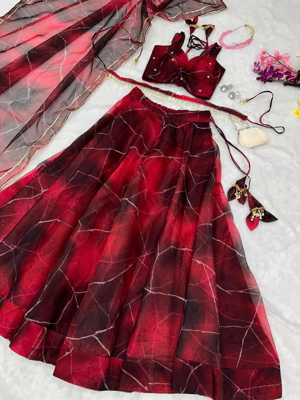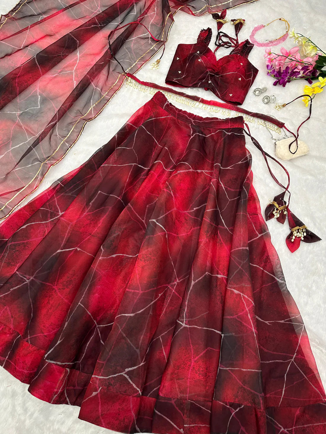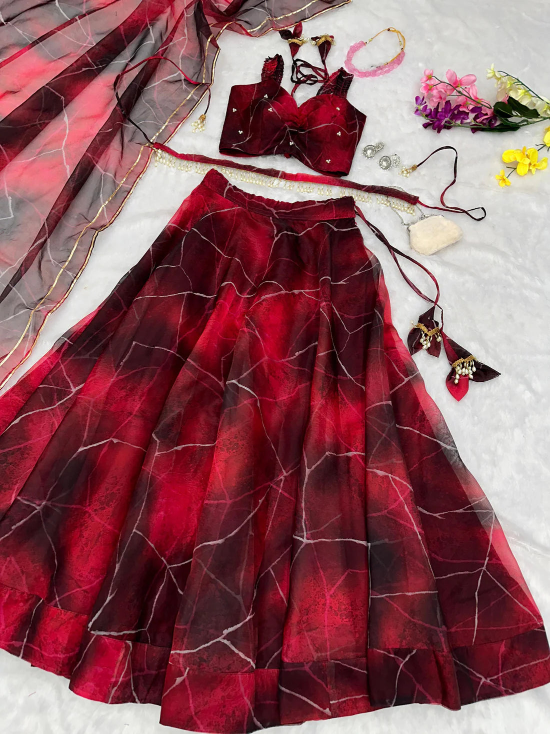 Lovely Digital Printed Maroon Color Organza Lehenga Choli