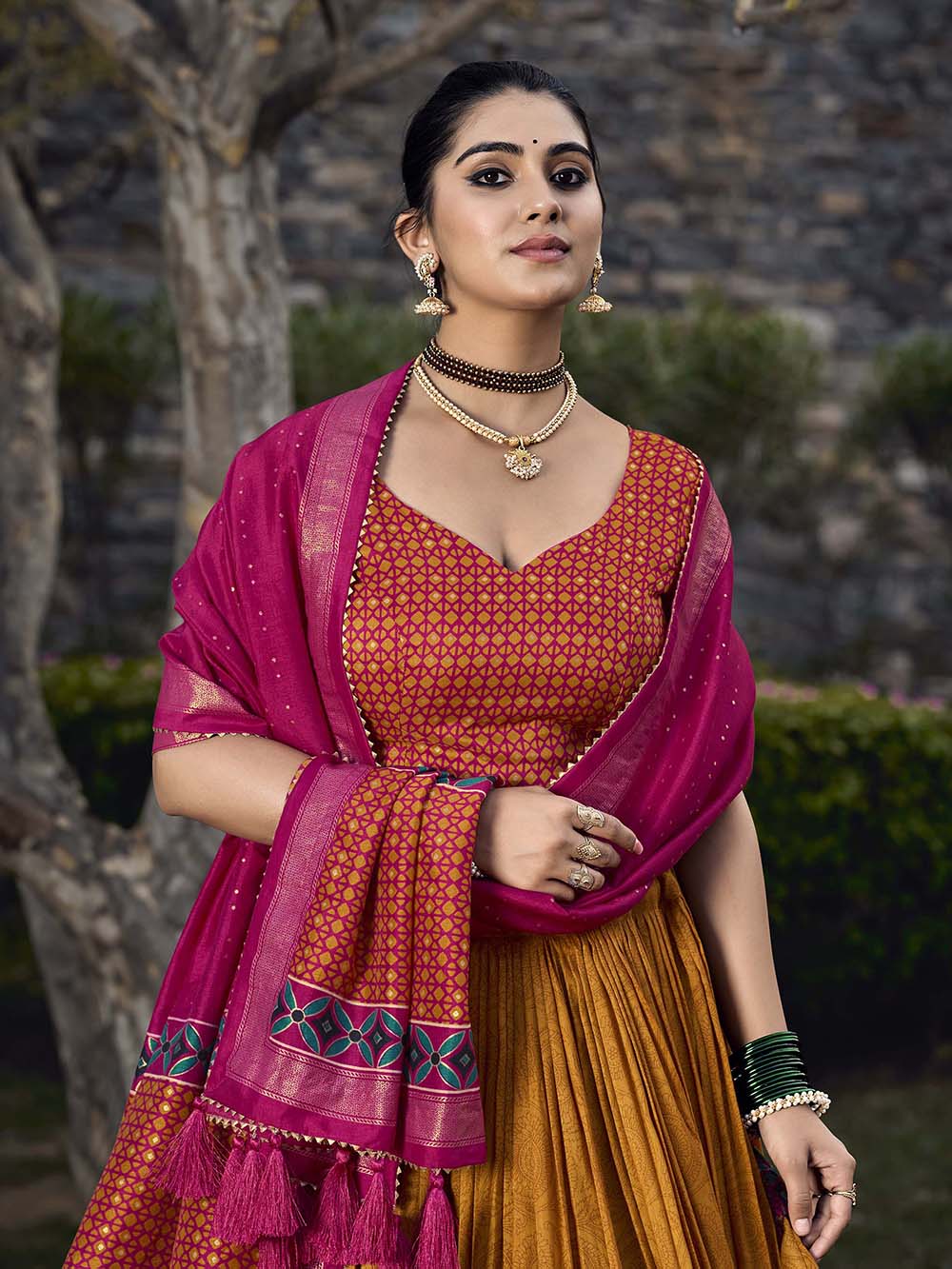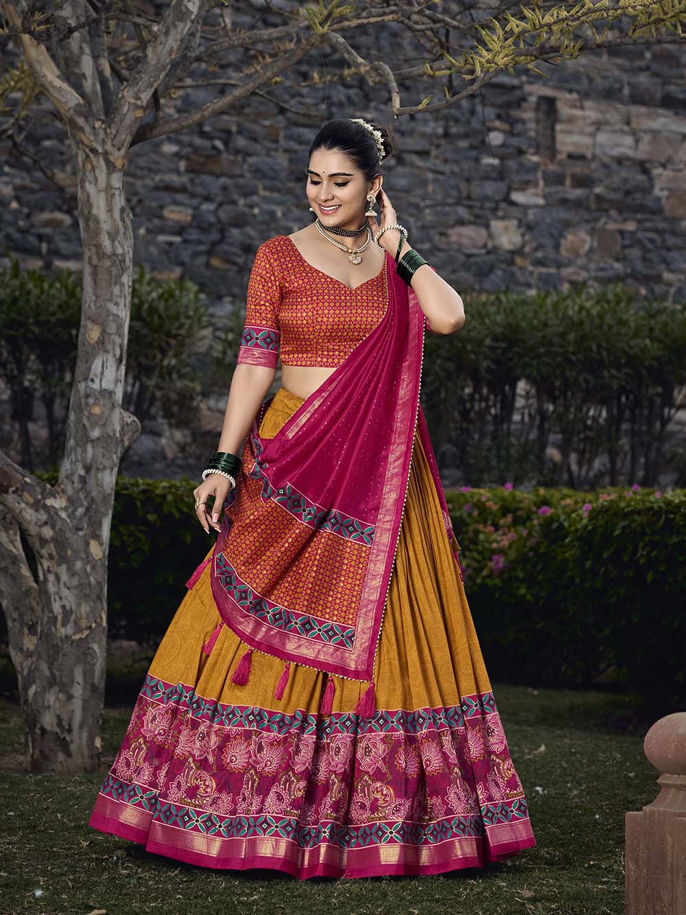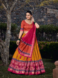 Mustard Color Floral Print With Foil Print Tussar Silk Lehenga Choli