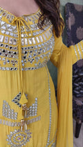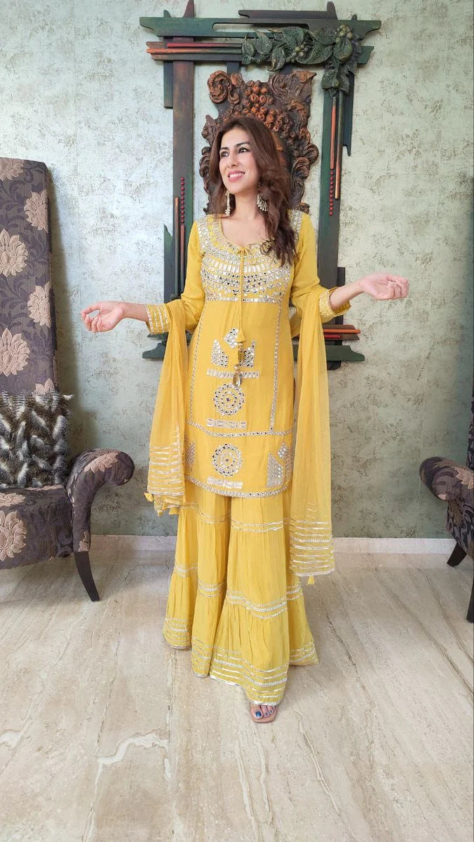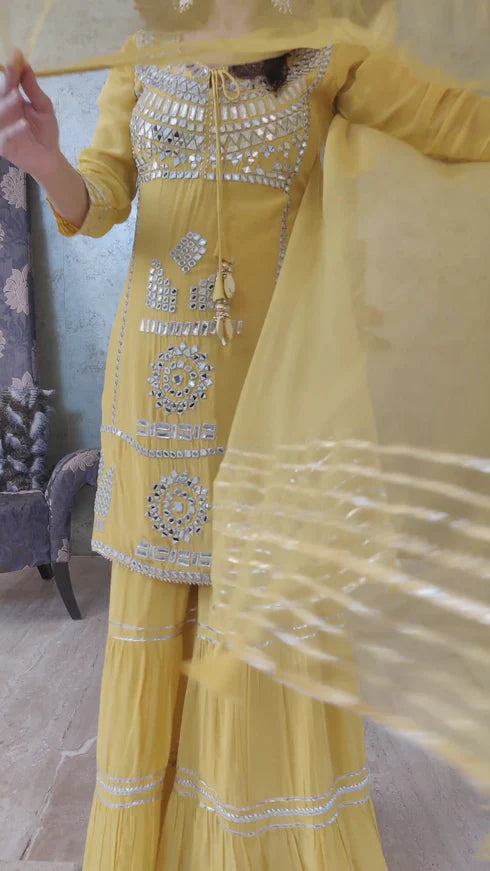 Designer Party Wear Mirror Work Yellow Sharara Suit Set