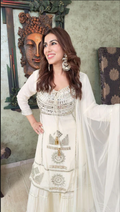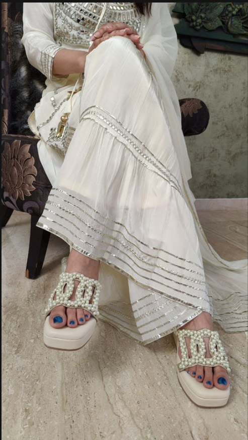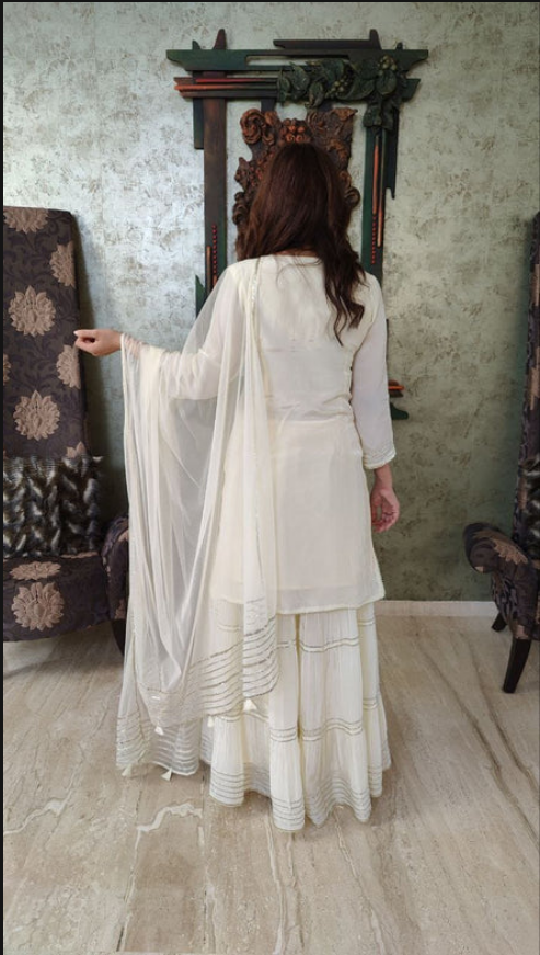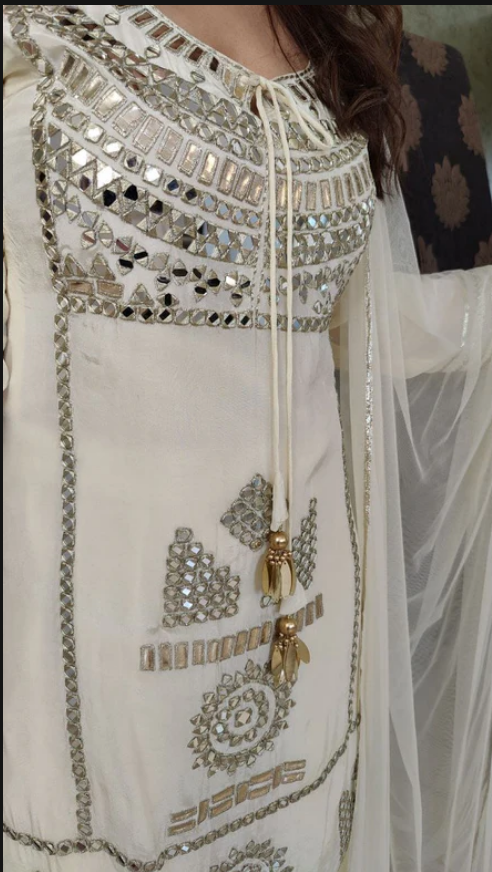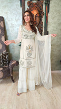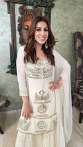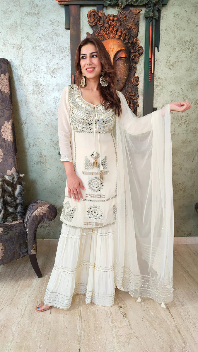 Designer Party Wear White Mirror Work Sharara Suit Set