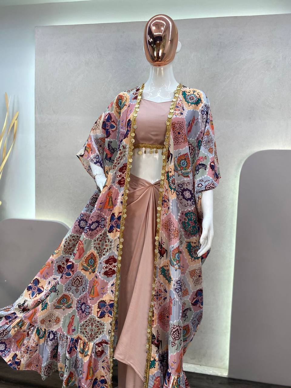 Designer Fancy Western Style Fiona Silk Printed and Coin Lace Work Koti, Choli With Western Bottom
