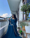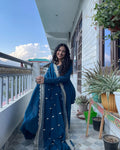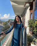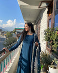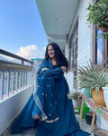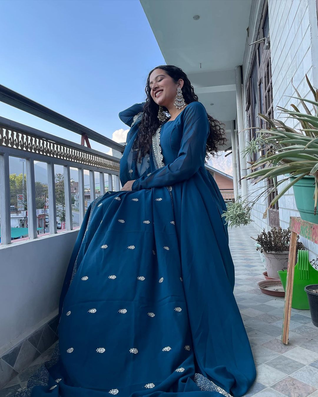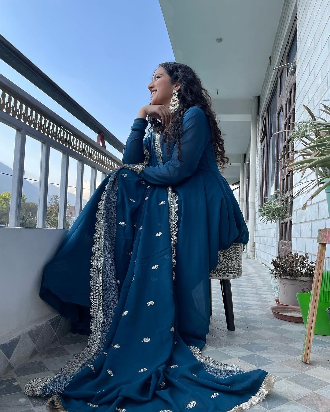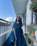 The Rama-colored plain soft georgette full-stitched Anarkali features intricate heavy embroidery work, exuding elegance and charm. It comes with a beautifully designed dupatta that complements the outfit perfectly. Perfect for special occasions and celebrations.