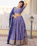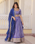 Dazzle in this blue pure viscose jacquard lehenga choli, complete with an unstitched blouse for personalized tailoring. The luxurious jacquard fabric exudes elegance, making it perfect for weddings and special occasions. This ensemble combines traditional charm with modern style, ensuring a stunning and memorable appearance.