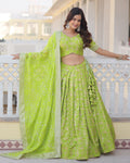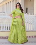 Embrace the enchanting allure of our Green Pure Viscose Jacquard Semi-stitched Lehenga Choli—a symphony of elegance and contemporary grace. Crafted from pure viscose jacquard fabric, the lehenga drapes beautifully, while the vibrant green hue adds a touch of freshness. The semi-stitched design allows for easy customization, ensuring a perfect fit that complements your style. Adorned with intricate detailing, this ensemble strikes a harmonious balance between tradition and modernity. Accompanied by an unstitched blouse piece, it offers the freedom to personalize your look with finesse. Ideal for festive occasions and celebrations, this green lehenga choli is a captivating choice, making a bold statement with its rich color and impeccable design. Step into the spotlight with this semi-stitched ensemble, embodying both sophistication and contemporary flair.