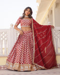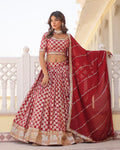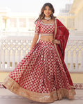 Step into elegance with this red pure viscose jacquard lehenga choli, which comes with an unstitched blouse for personalized tailoring. The rich jacquard fabric exudes sophistication, making it ideal for weddings and special occasions. This ensemble combines traditional charm with modern style, ensuring a stunning and memorable appearance.