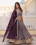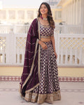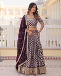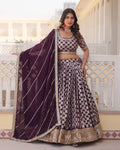 Elevate your ethnic ensemble with this wine-colored pure viscose jacquard lehenga choli, featuring an unstitched blouse for personalized tailoring. The rich jacquard fabric exudes elegance, making it perfect for weddings and special occasions. This ensemble promises a blend of traditional charm and modern style, ensuring a sophisticated and memorable appearance.