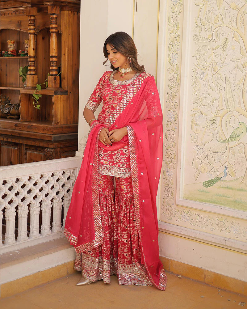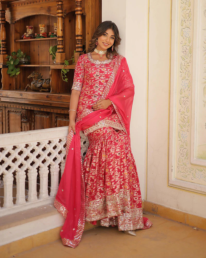 Rani Pink Color Viscose Jacquard Three Piece Gharara Suit