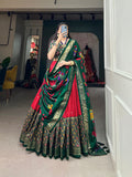 - Immerse yourself in the vibrant beauty of India with our luxurious print with foil work tussar silk red color lehenga choli set.