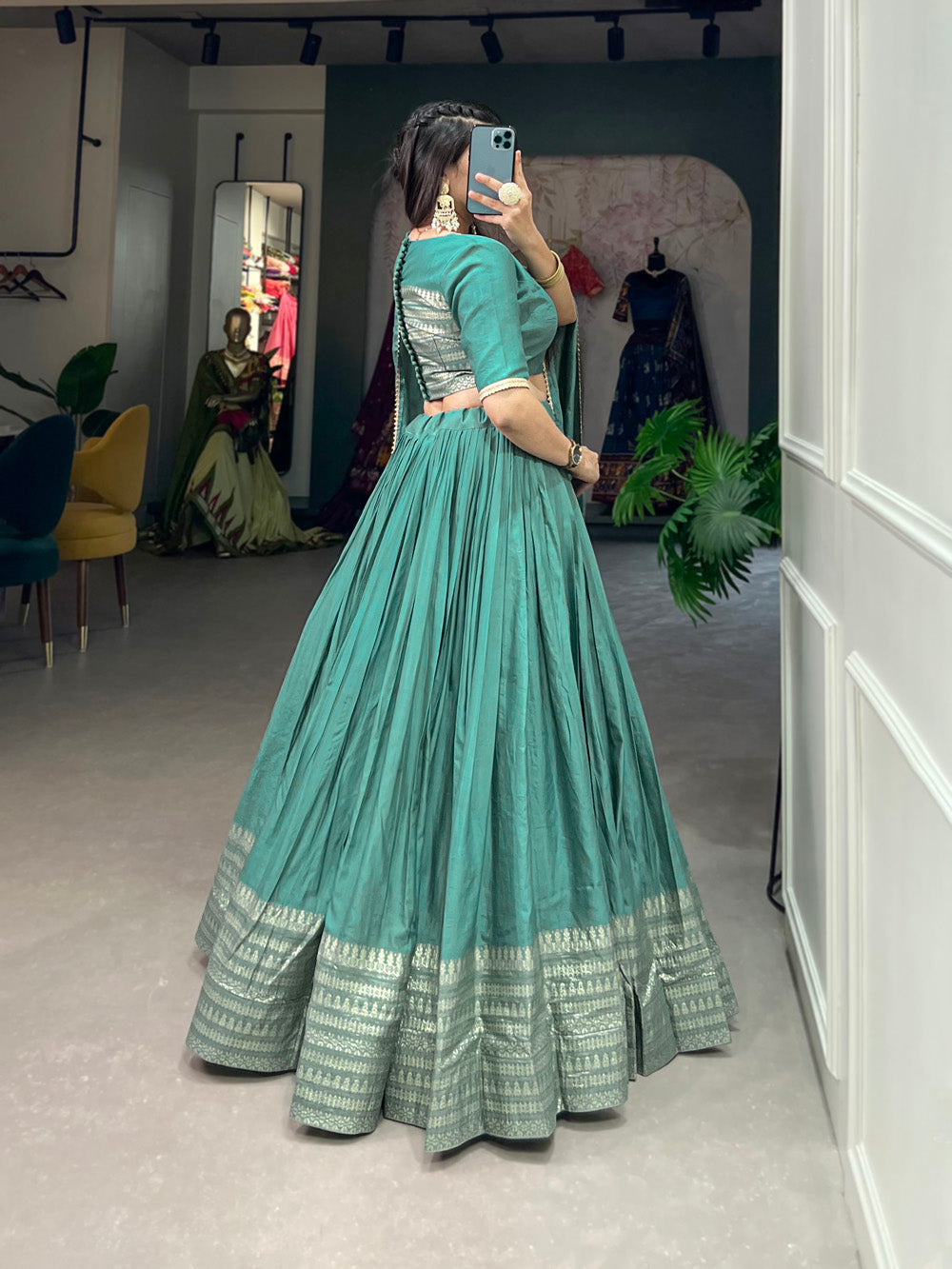 - Chanderi see green color lehenga choli is a traditional Indian dress. It is known for its exquisite fabric, intricate weave and timeless elegance.