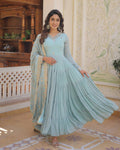 Sky Color Faux Georgette Designer Gown With Dupatta