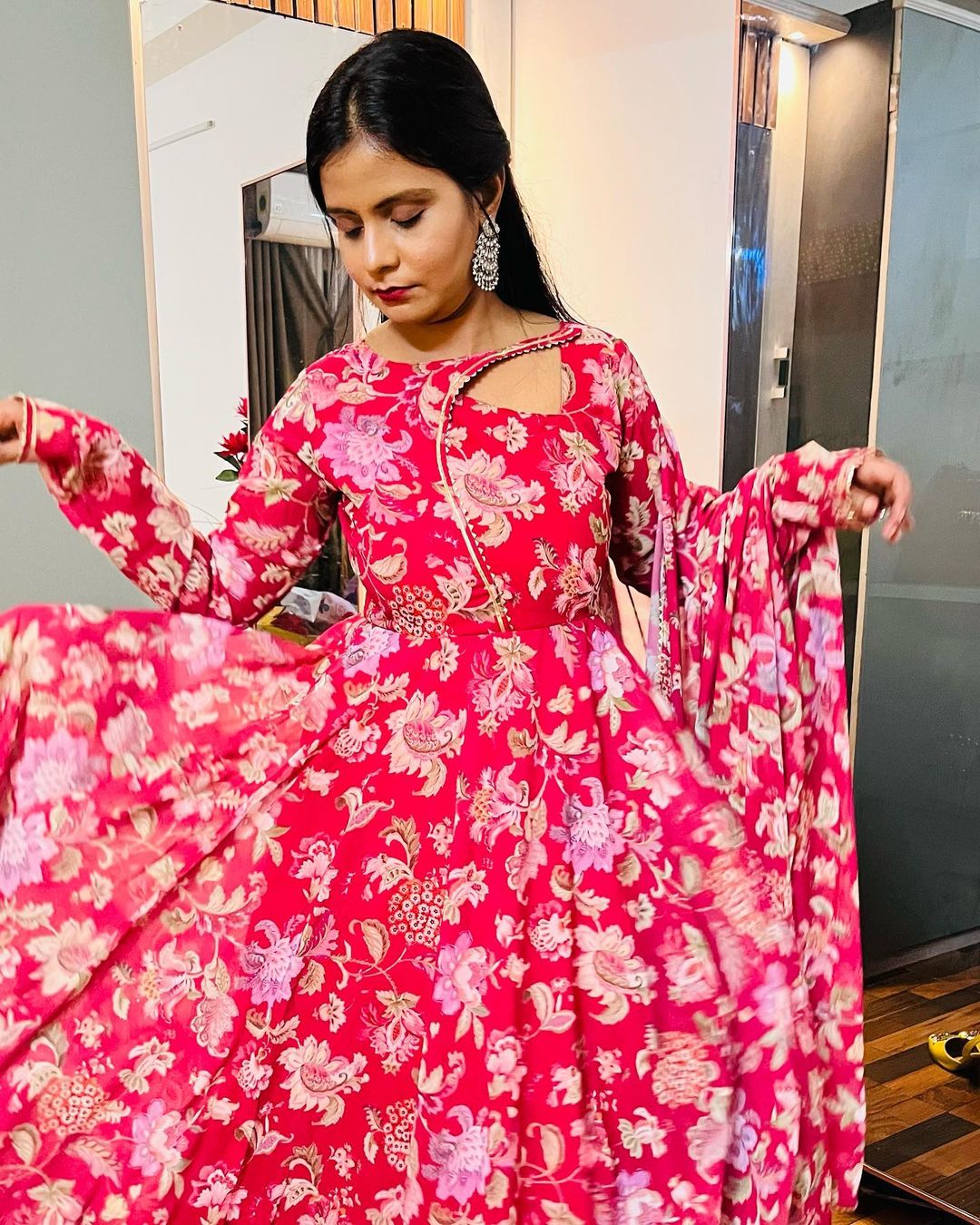 This stylish three-piece Anarkali suit features a beautiful pink floral design and comes fully stitched. The suit includes a graceful neck design, adding an elegant touch to the overall look. Perfect for any occasion, this outfit is sure to make a statement. š«°š»ā¤ļø