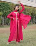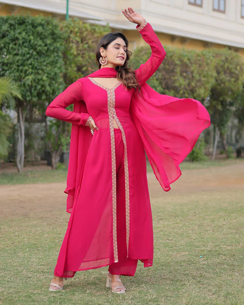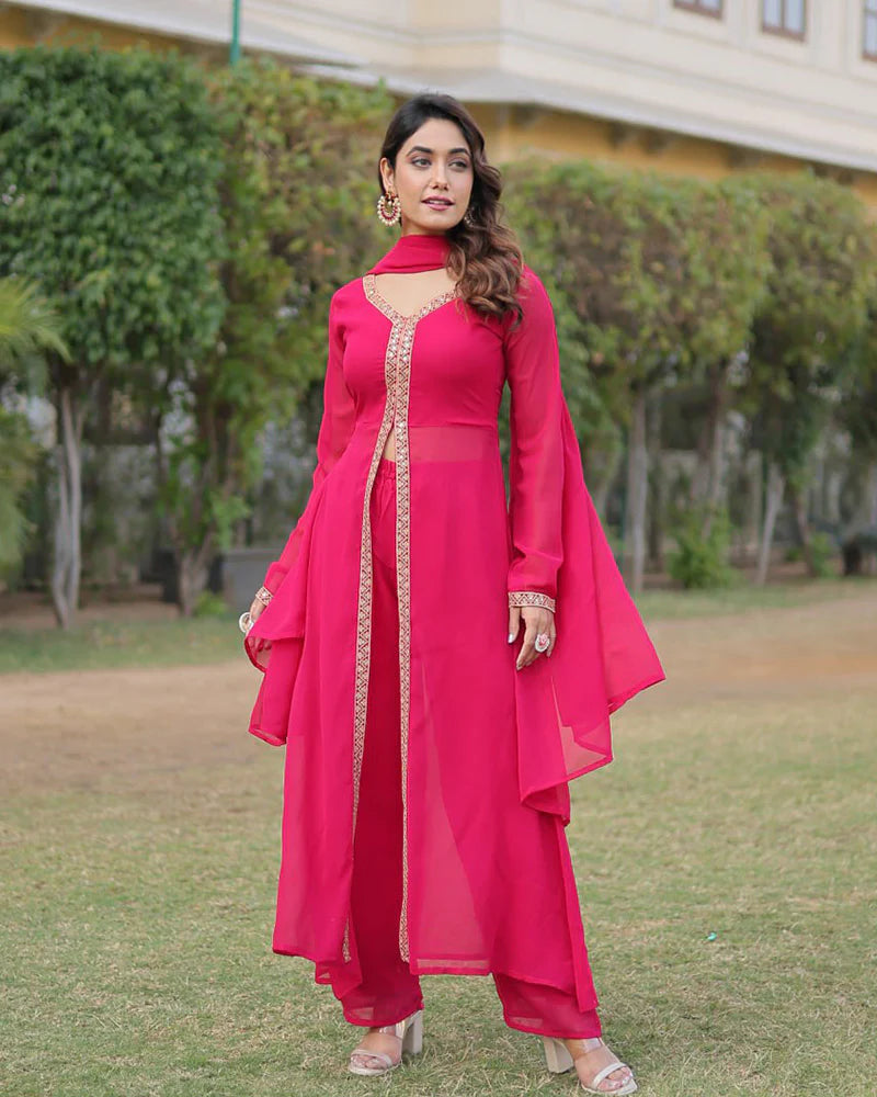 Western Designer Rani Pink Color Georgette Three Piece Kurti Suit