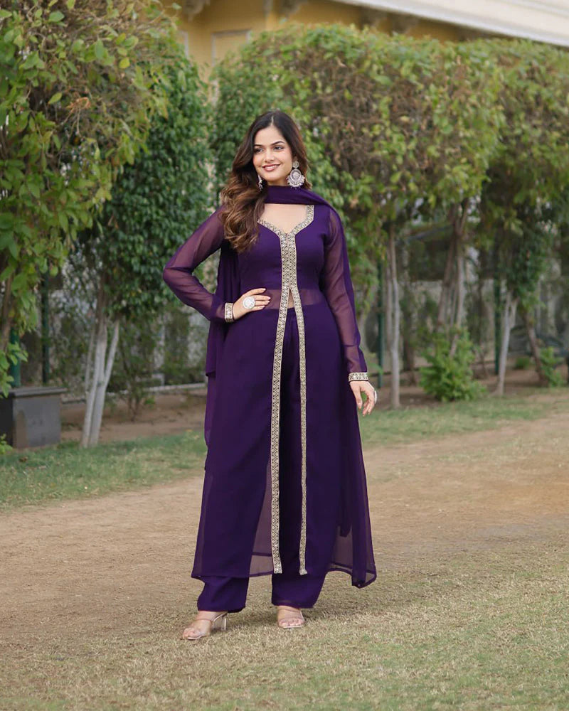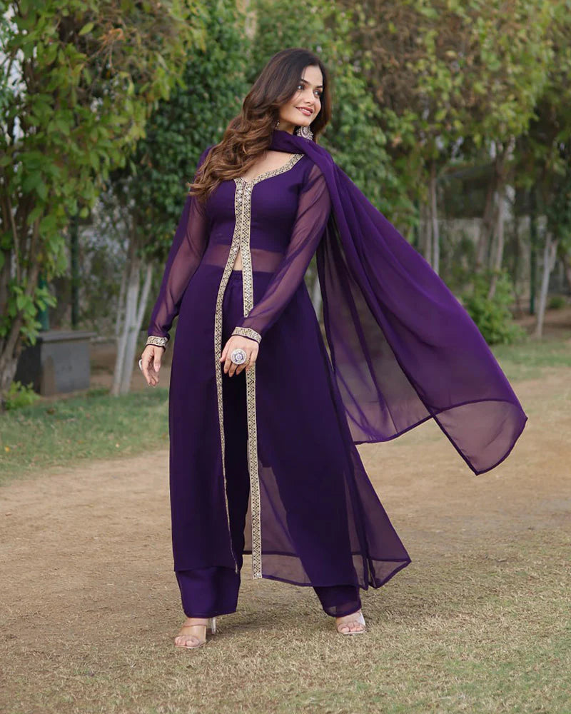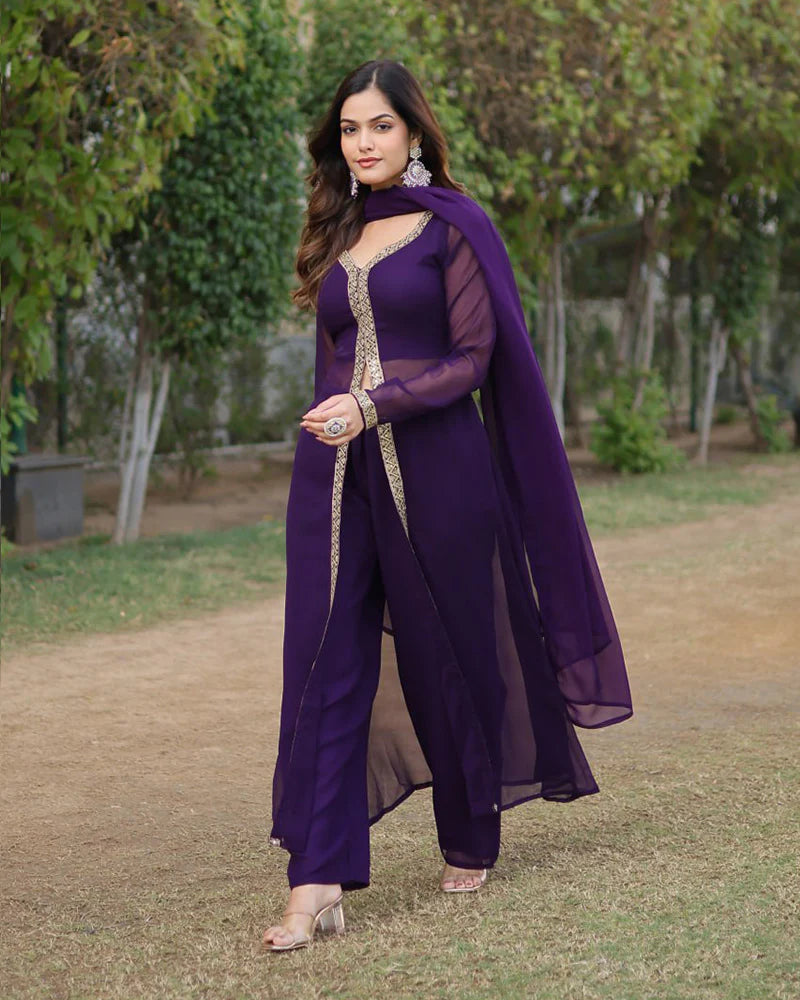 Step into contemporary elegance with this Western Designer Wine Color Georgette Three-Piece Kurti Suit. The rich wine hue adds sophistication, while the georgette fabric enhances the modern appeal. Meticulously designed, the three-piece suit includes a stylish kurti, paired with coordinating bottoms and a dupatta, creating a fashionable ensemble. Ideal for social gatherings, parties, or special occasions, this Wine Color Georgette Kurti Suit promises a chic and refined presence. Embrace the modern aesthetic with this statement piece that celebrates the richness of wine and the stylish allure of Western design for a truly captivating and memorable look.