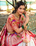 Embrace elegance with this White Color Jacquard Silk Lehenga Choli. The pristine white hue combined with the rich texture of jacquard silk creates a timeless look. This set includes an unstitch blouse, allowing you to tailor it to your perfect fit and style. Ideal for weddings and festive occasions, this lehenga choli exudes sophistication and grace.