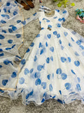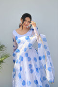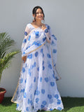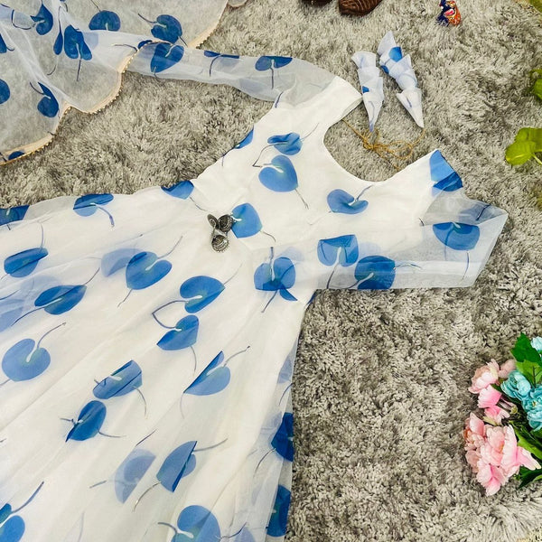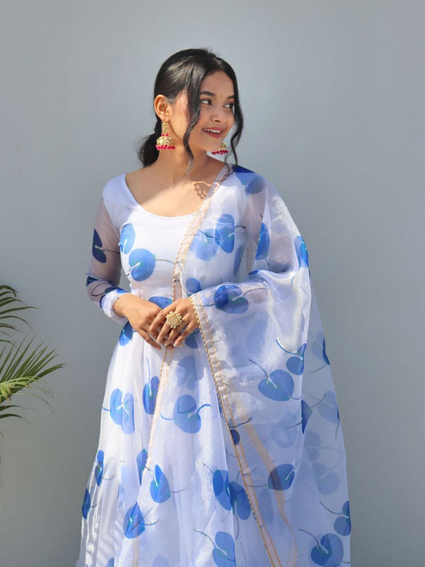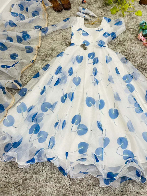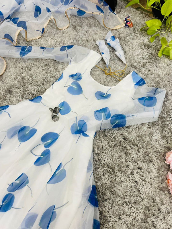 White & Sky Printed Beauty Gown And Four Side Golden Gotta Lace Border Dupatta Collection