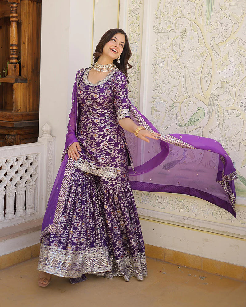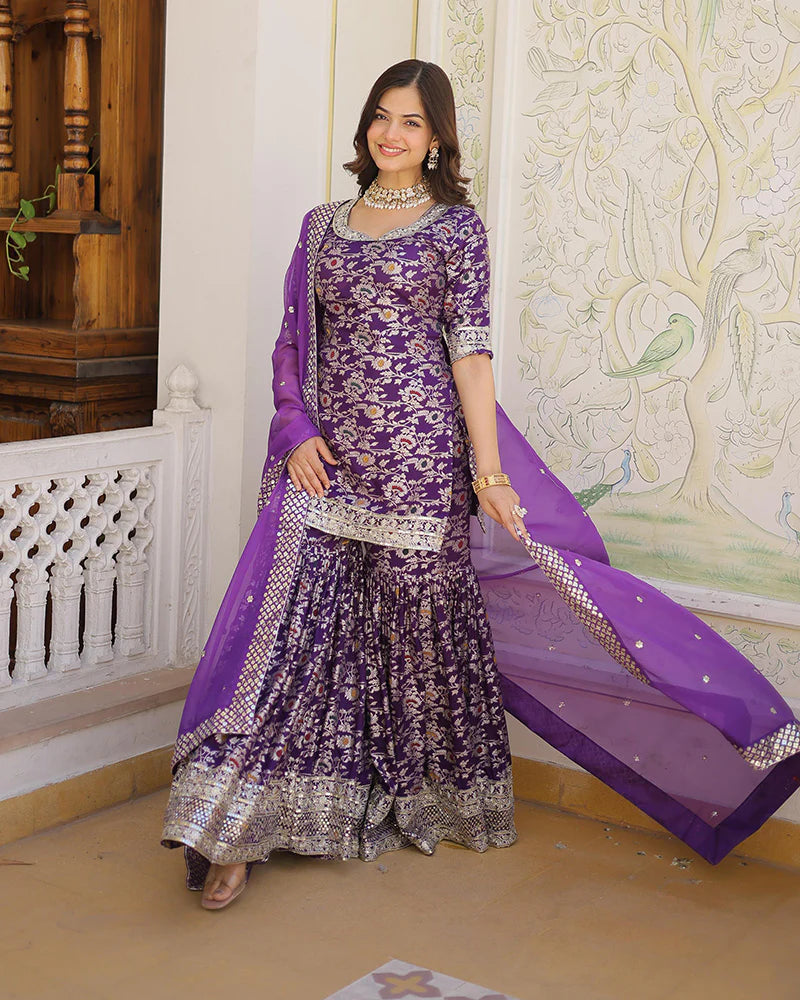Wine Color Viscose Jacquard Three Piece Gharara Suit